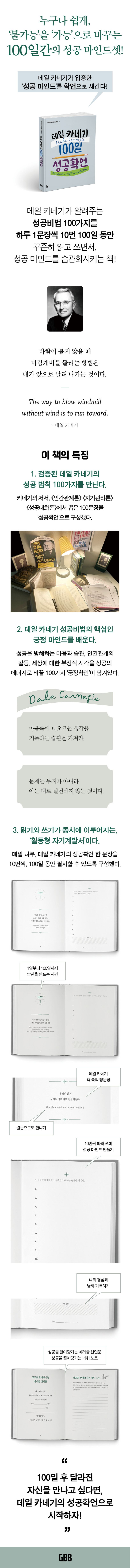 《데일 카네기 100일 성공확언》은 나, 타인, 사회를 생각하는 데일 카네기의 비즈니스 통찰이 집약된 100가지 성공비법을 하루 1문장씩, 10번 반복적으로, 100일 동안 꾸준히 읽고 쓰면서 성공을 위한 긍정 마인드를 습관화할 수 있는 책이다. 성공의 꿈은 모두에게 있지만, 그 꿈을 현실로 만드는 사람의 습관은 다르다. 성공의 꿈을 현실로 만들고 싶은 분들이라면, 《데일 카네기 100일 성공확언》이 가장 쉽게 도전할 수 있는 첫걸음이 될 것이다.