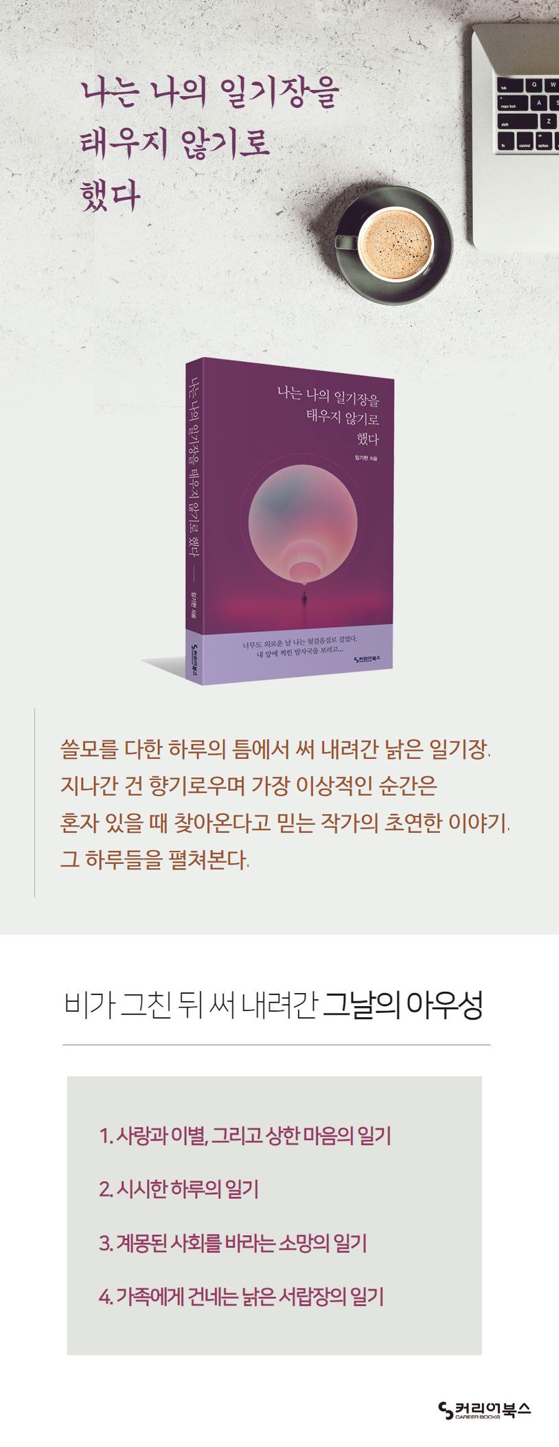 에세이 〈죽기 싫어 떠난 30일간의 제주 이야기〉 이후 3년 만에 출간된 신작 〈나는 나의 일기장을 태우지 않기로 했다〉는 아픔을 딛고 사계절을 찬미하는 보통의 하루로 복귀한 작가의 이야기다.