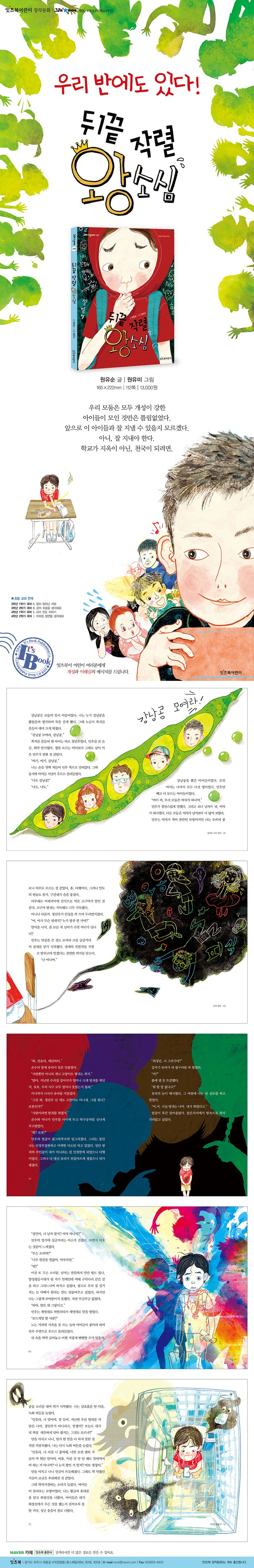 세상이 다양한 성격과 외모를 가진 사람들로 조화를 이루는 것처럼, 우리 아이들의 학급도 작은 세상입니다. 활달하고 활동적인 아이, 속이 깊고 세심한 아이, 거침이 없고 대범한 아이 등 아이들의 성격과 성향은 정말 다양하니까요. 그런데 어떤 성격이든 장점과 단점이 있기 마련이고 좋은 점 위주로 보느냐, 나쁜 점 위주로 보느냐에 따라서 사람이 180도 달라 보이기도 합니다. 『뒤끝 작렬 왕소심』에는 다섯 명의 개성 강한 아이들이 등장합니다. 외향적인 성격으로 늘 친구들에게 인기가 많은 정민우, 게임을 좋아하고 주변 사람들에게 무심한 김은수, 자신을 꾸미기 좋아하고 여성적인 장미나, 남자 같은 외모에 당차고 똑똑한 민유라. 특히 주인공 정민이는 새 학기에 낯선 친구들과 새로 사귀는 게 무척 힘이 들어서 등교하기 싫을 정도로 수줍음이 많습니다. 우리 어린이들이 『뒤끝 작렬 왕소심』을 읽고 각자가 다르지만 모두 친구라는 것을 알고 개개인이 가지고 있는 개성에 대해서 생각해 보는 기회를 갖기 바랍니다.