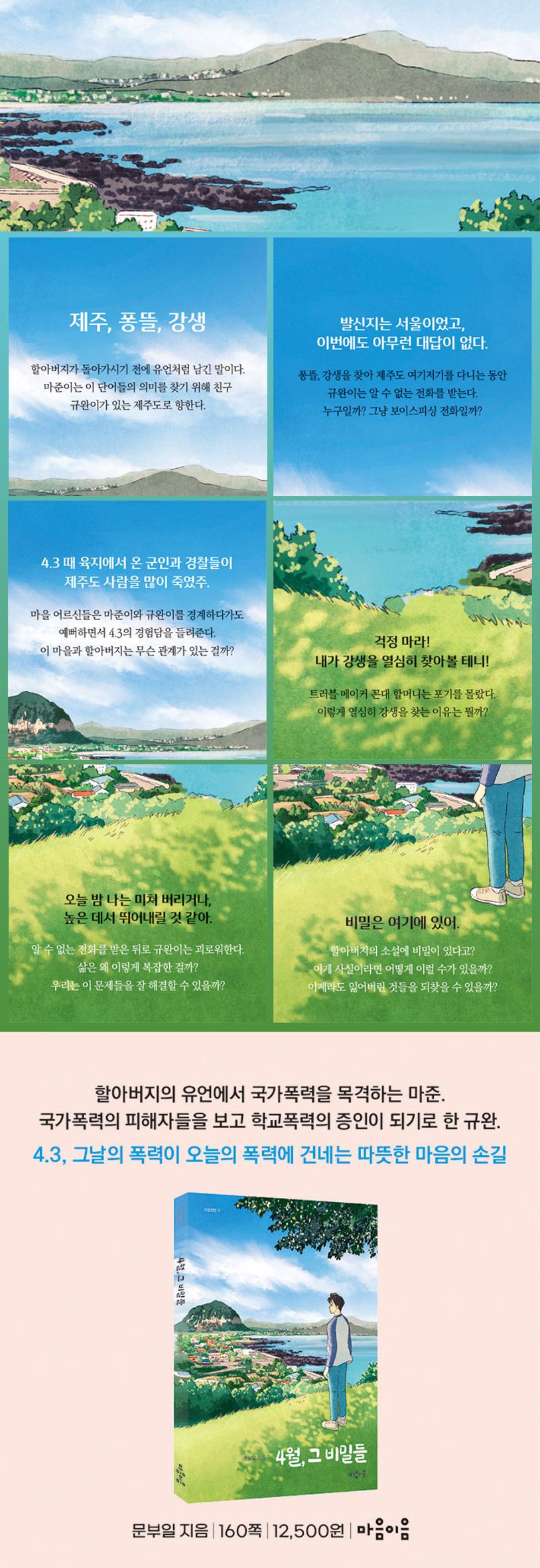제주, 퐁뜰, 강생. 마준이는 할아버지가 유언처럼 남긴 세 단어의 의미를 알기 위해서 친구 규완이가 있는 제주로 향한다. 제주에서 규완이와 유언을 파헤치는 중에 규완이에게 알 수 없는 전화가 걸려온다. 할아버지의 소설 속 마을과 비슷한 한목리 마을의 노인들은 마준이와 규완이를 경계하면서도 예뻐한다. 마을 할머니들이 들려주는 4.3의 경험담은 퐁뜰, 강생과 한층 가까워지고, 할아버지의 유언이 밝혀지는 순간 모두 놀라움을 금치 못한다. 학교 폭력의 증인으로 괴로워하는 규완이는 오랜 시간 힘들게 사는 어르신들을 보면서 마음이 흔들린다. 생소한 제주 4.3을 흥미롭게 풀어낸 이 작품은 사람을 사랑하고, 역사와 사회에 정직할 수 용기를 불러일으킨다.