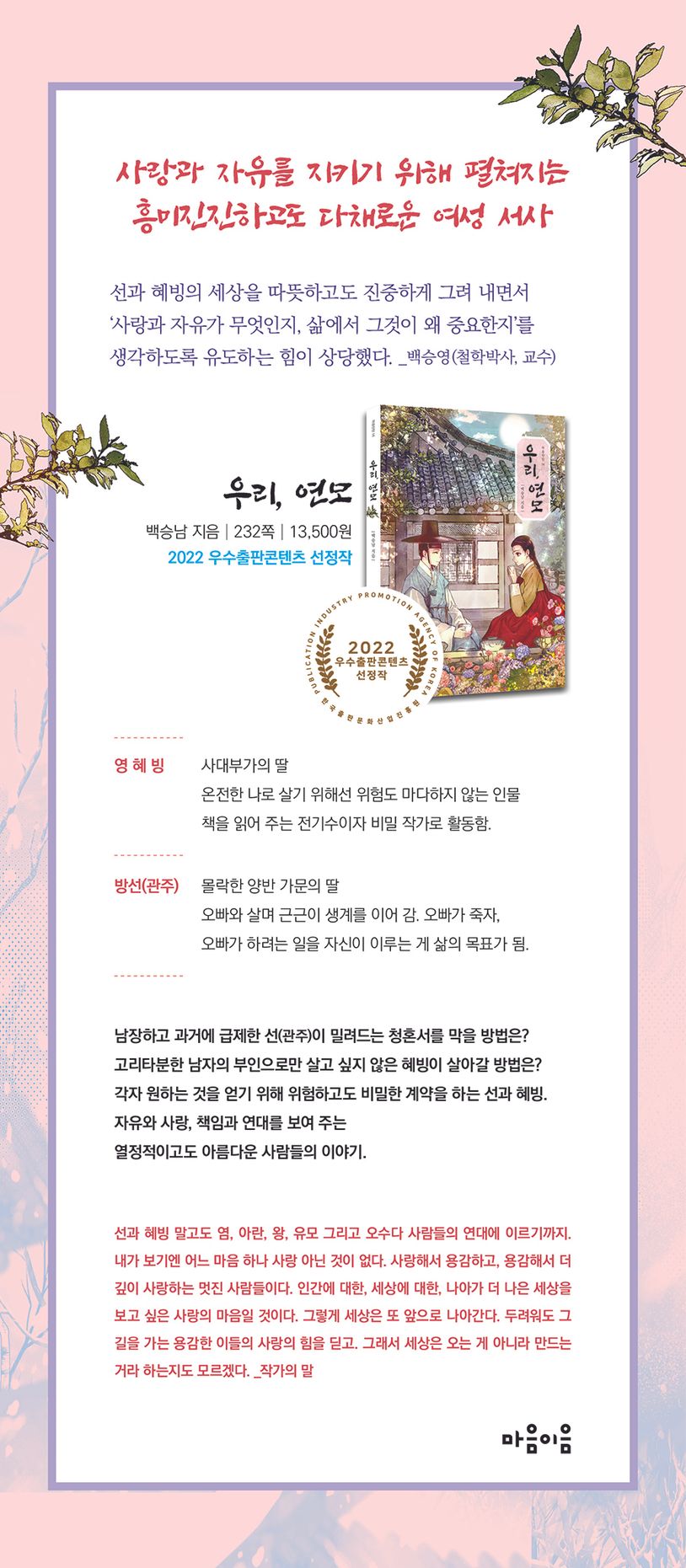 죽지 못해 사는 선은 오빠의 소망을 자신이 이루기 위해서 남장을 하고, 혜빙은 결혼을 목숨처럼 여기는 아버지와의 갈등 속에서 탈출구를 찾는다. 여자임을 감춰야 하는 선과 온전한 자신으로 살고 싶은 혜빙은 혼인이라는 위험한 계약을 하고, 아슬아슬함 속에서 서로 연대하며 살아간다. 서로에게 점차 스며드는 선과 혜빙. 어느덧 선은 혜빙이 있어서 자기 삶 또한 사랑하게 되었고, 혜빙을 위해서라면 어떤 어려움도 피하지 않을 강인한 힘이 생겼다. 혜빙 또한 선이 오빠의 망령에서 벗어나 본래의 자기 모습으로 안전하게 돌아오도록 이끌어 주고자 한다. 그러나 두 사람이 해결할 시간도 없이 외부 사람들의 의심과 공격이 시작되는데……. 사랑과 자유, 책임과 연대를 보여 주는 열정적이고도 아름다운 여성들의 이야기.