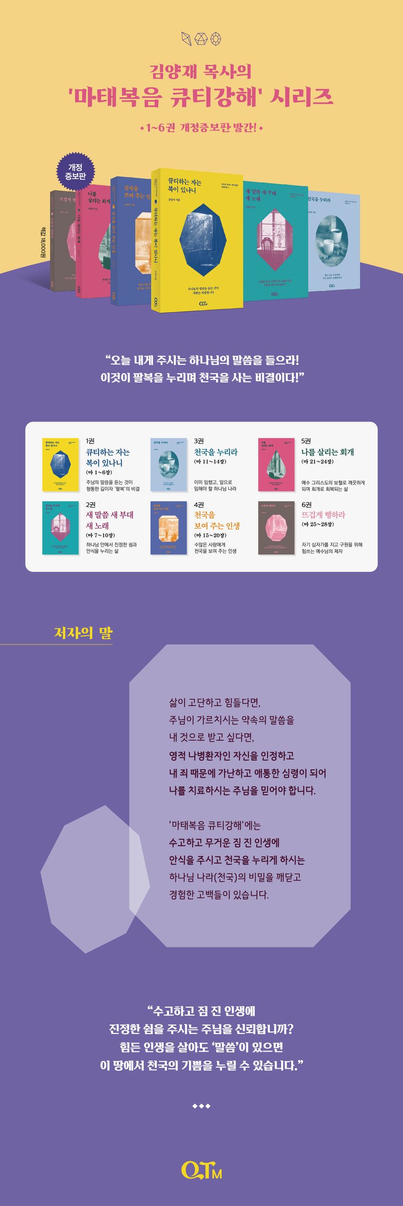 김양재 목사의 마태복음 큐티강해 1권 『큐티하는 자는 복이 있나니』는 총 4개 Part로 구성되어 있습니다. Part1은 ‘팔복의 인생을 준비하자’, Part2는 ‘천국의 가치관을 갖자’, Part3은 ‘주님의 온전함을 배우자’, Part4는 ‘가르침대로 기도하자’를 내용으로 주님의 말씀을 듣는 것이 형통한 길이고 ‘팔복’의 비결임을 전합니다.