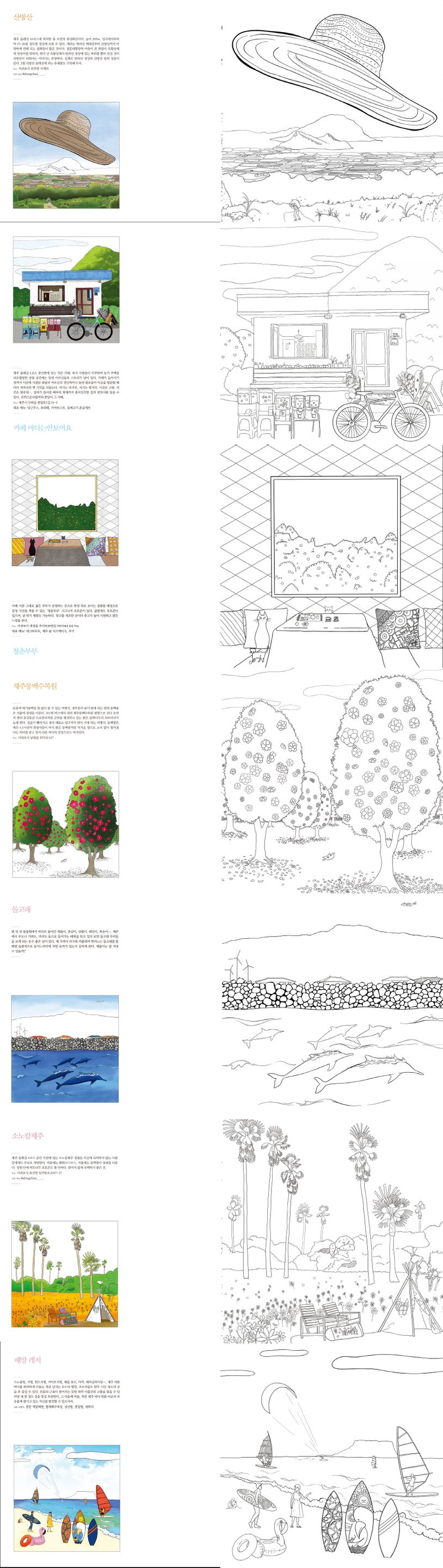 〈제주 컬러링 여행〉은 여타 컬러링과는 달리 해당 지역의 여행정보를 담고 있다. 그래서 컬러링을 하며 여행에세이를 읽는 즐거움을 동시에 누릴 수 있다. 또한 각 그림마다 저자가 직접 작업한 컬러링 샘플을 제공하고 있어 색칠에 어려움을 겪는 독자들에게 큰 도움이 된다.
