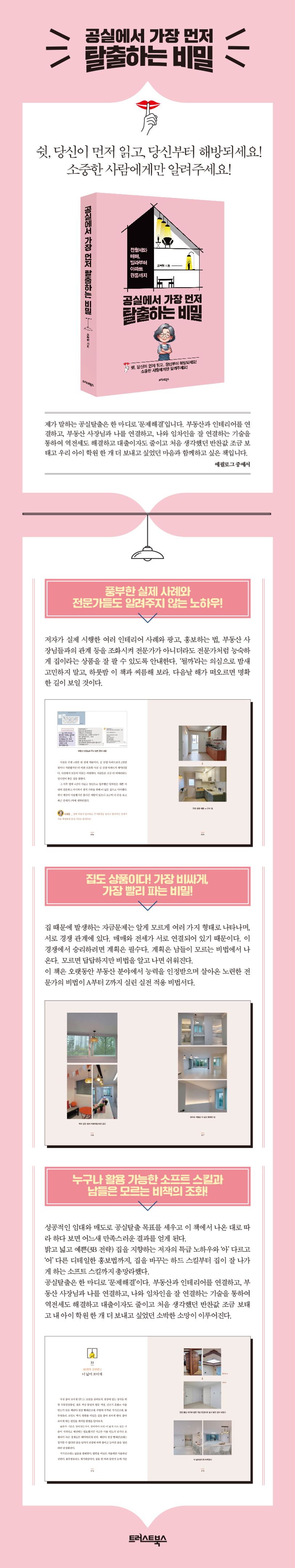 제가 말하는 공실탈출은 한 마디로 ‘문제해결’입니다. 부동산과 인테리어를 연결하고, 부동산 사장님과 나를 연결하고, 나와 임차인을 잘 연결하는 기술을 통하여 역전세도 해결하고 대출이자도 줄이고 처음 생각했던 반찬값 조금 보태고 우리 아이 학원 한 개 더 보내고 싶었던 마음과 함께하고 싶은 책입니다.