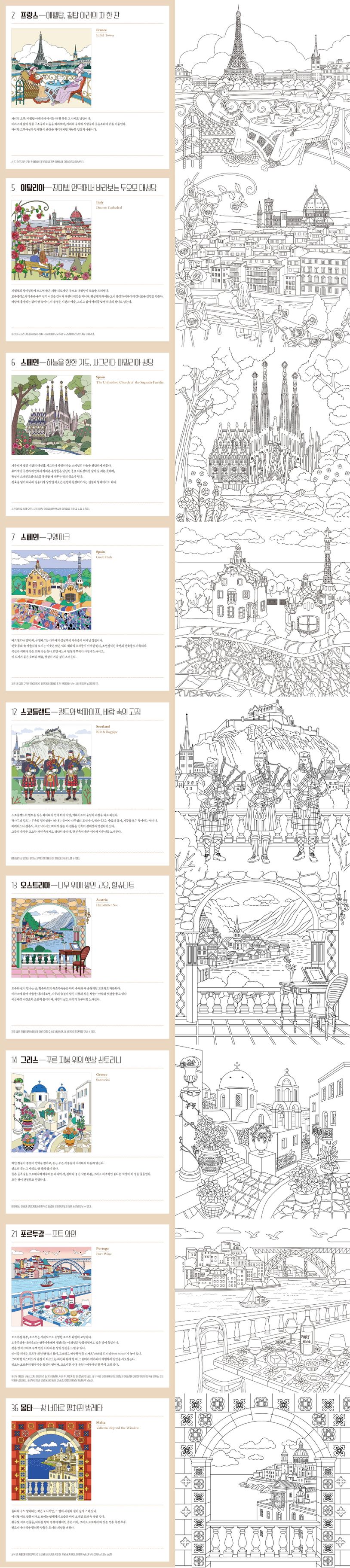 유럽은 격조 높은 여행지와 동화 같은 명소가 공존하기에 여행자의 오감을 자극한다. 그리하여 발을 딛는 모든 곳이 당신의 추억으로 기록된다. 유럽에 다녀온 적이 있다면 추억을 되새기는 마음으로, 앞으로 갈 계획이라면 꿈꾸는 마음으로 컬러링에 도전해 보자. 칠하는 기쁨뿐만 아니라, 당신의 여행 스케줄에 큰 영감을 줄 것이다.