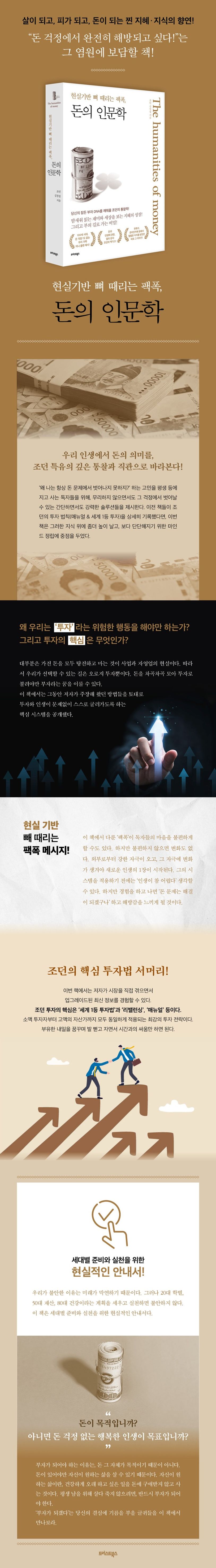 그동안 숱한 베스트셀러를 내왔던 저자(조던 김장섭)는, 오로지 투자 하나만을 위한 책을 써왔던 과거의 경로에서 벗어나, 이번에는 돈이 우리 인생 전반에 미치는 영향을 중심으로, 돈의 의미를 깊이 있게 통찰했다. 또한 ‘왜 나는 항상 돈 문제에서 벗어나지 못하지?’ 하는 고민을 평생 등에 지고 사는 독자들을 위해, 무리하지 않으면서도 그 걱정에서 벗어날 수 있는 간단하면서도 강력한 솔루션들을 제시한다. 구체적인 방법들은 이전 책들에서 충분히 제시했으므로, 이번 책에서는 거시적인 안목으로 인생 전체를 관통하는 돈과 인생의 흐름을 추적하고, 스스로 솔루션을 깨닫도록 안내한다.