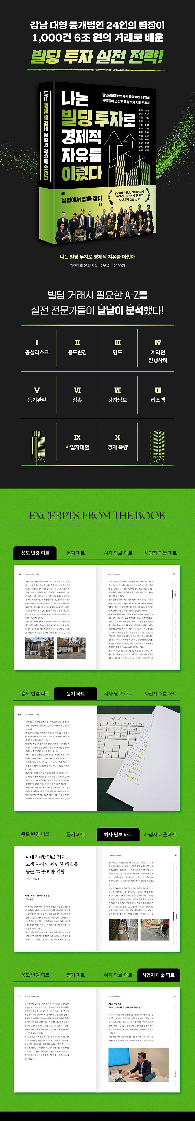 《나는 빌딩 투자로 경제적 자유를 이뤘다》은 상업용 부동산 투자 실무의 최전선에서 뛰고 있는 전문가들이 직접 경험한 24개의 사례를 통해, 실제 시장에서 마주치는 변수와 문제 해결 과정을 생생히 기록한 실전형 투자 안내서입니다. 공실 리스크, 용도변경, 명도, 상속, 리스백 등 복잡한 부동산 거래의 전 과정을 실제 사례 중심으로 다루며, 단순한 계약을 넘어 고객과의 신뢰, 세무·법무 협업, 현장 대응력까지 보여줍니다. 빌딩 중개인의 내밀한 전략과 사고 방식이 드러나는 이 책은 실전 투자자뿐 아니라 중개 실무자에게도 귀중한 지침서가 됩니다.