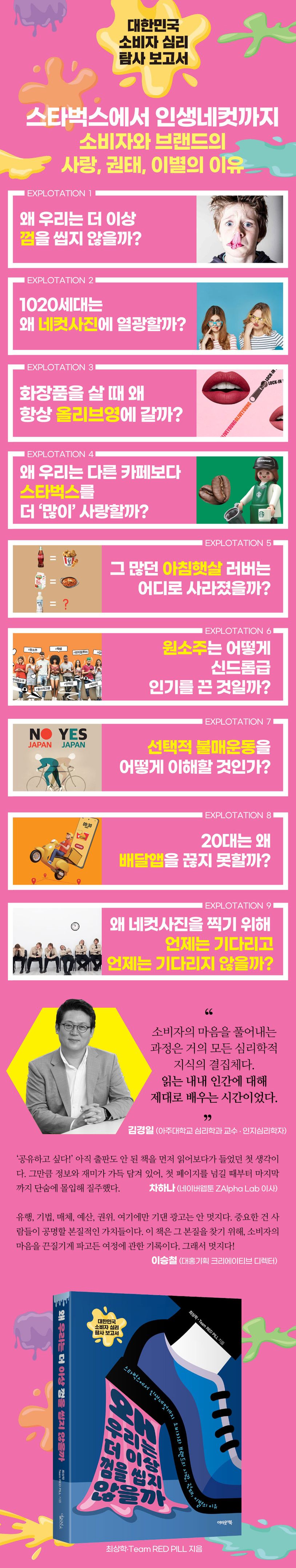 이 책은 “도대체 왜?”라고 질문할 수밖에 없는, 이유를 알 수 없는 소비자 행동의 비밀을 파헤친다. ‘국민 간식’ 껌의 하락부터 올리브영과 스타벅스의 독보적 존재감, 퇴물 취급받던 즉석사진의 화려한 부활, 배달 음식을 시킬 때 반사적으로 켜는 배달앱, 아침햇살의 급격한 추락. 탐사대원들은 ‘소비자’에 방점을 찍고, 그들의 마음을 끈질기게 파고든다.