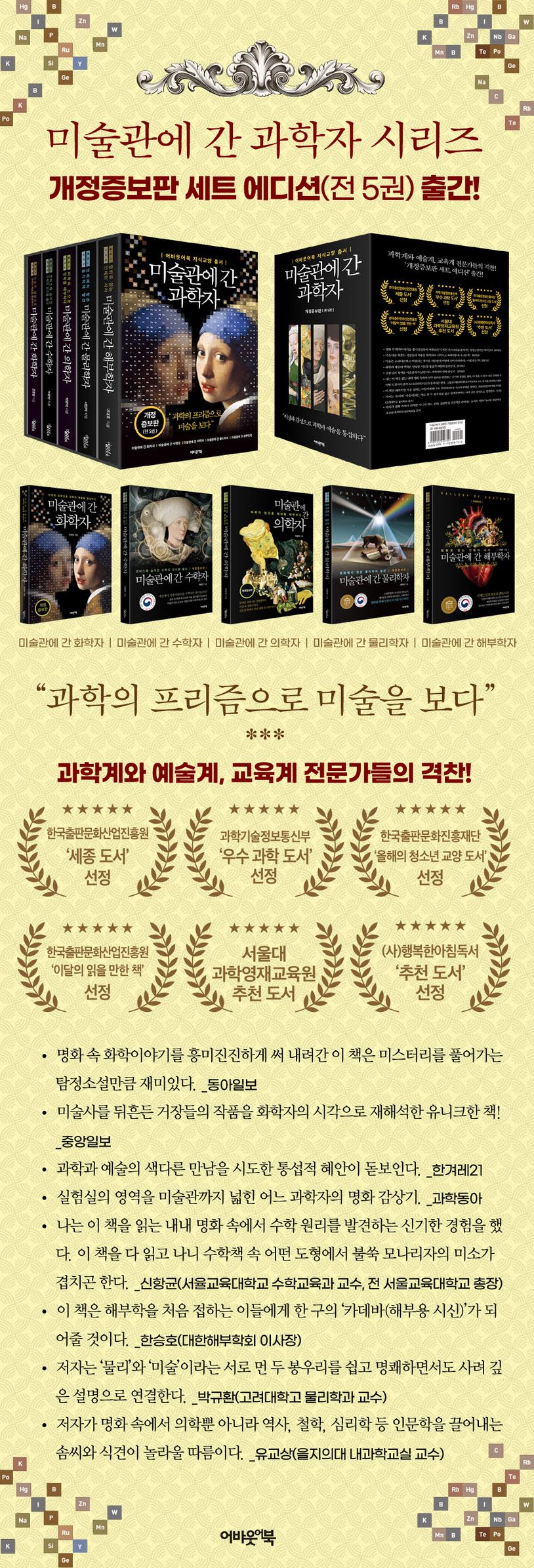 그리고, 이들 이학자(理學者)의 범상치 않은 이야기는 어바웃어북 에디터들의 손을 거쳐 책으로 묶여 ‘미술관에 간 과학자’ 시리즈로 탄생했습니다. 출간 이후 각계 전문가들의 격찬을 받아온 이 시리즈는 2024~2025년에 새로운 내용을 담아 개정증보판으로 한층 더 진화했습니다. 개정증보판 출간을 기념해, 새롭게 단장한 다섯 권을 묶어 개정증보판 세트 에디션을 선보이게 되었습니다.