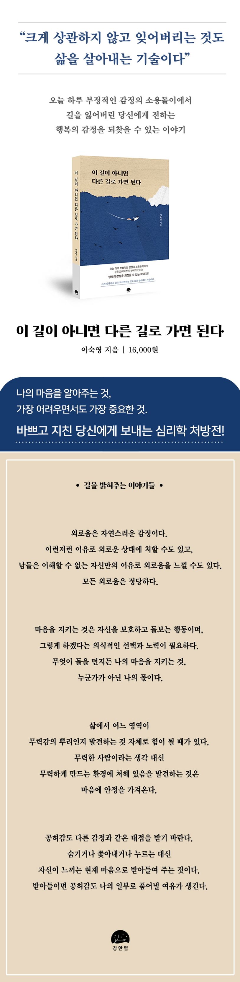 이 책은 부정적인 감정의 원인을 담고 있다. 그리고, 작가가 전하는 따뜻하고도 일상적인 해답도 담겨있다. 누구에게나 통하는 만능열쇠란 세상에 존재하지 않는다. 하지만, 누군가를 위하는 진심은 모든 문제 해결의 첫걸음이다. 이 책에는 많은 이들이 덜 아파하고, 더 행복하길 바라는 작가의 진심이 있다. 우리는 이 책을 읽고 조금 더 스스로에 아픔에 귀 기울여 주고, 보듬어 줄 수 있는 사람이 될 수 있을 것이다. 그리고 이 길이 아니면 다른 길로 갈 수 있는 용기를 얻게 될 것이다.
