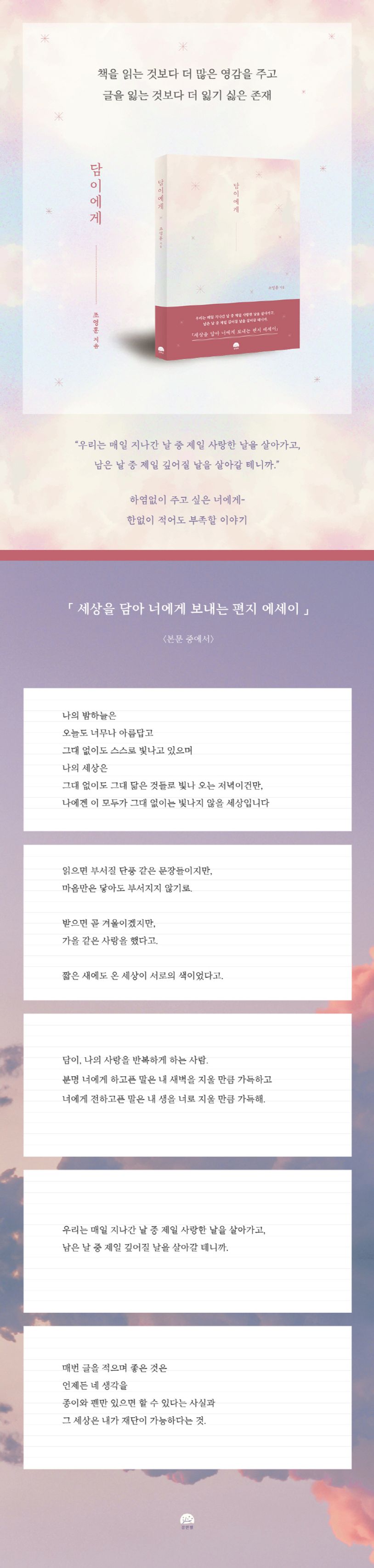 ‘담이에게’는 무엇이든 담을 수 있고, 무엇도 함부로 담을 수 없는 ‘담이’에게 보내는 편지다. 저자는 담이라는 존재에 끊임없는 친애를 보낸다. 저자에게 담이는 사랑이자, 글이자, 생이기 때문에. 담이는 어느 날에는 ‘당신’이고, 어느 날에는 ‘그대’이고, 어느 날에는 ‘우리’다. 사계절에 거쳐 꾸준히 사랑을 보내오는 저자의 진심에 어느 순간, 내가 담이임을 자연스럽게 받아들이게 된다.