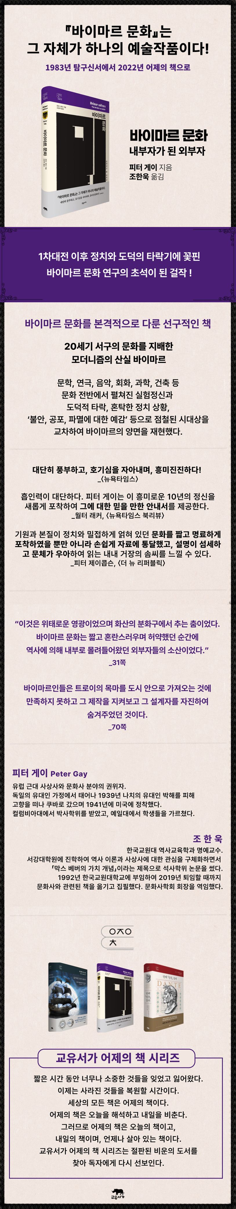 “바이마르공화국은 짧고 열에 들뜬 것 같지만 매혹적인 삶을 살았다.” 이는 2001년에 나온 『바이마르 문화』 노턴판 서문의 첫 문장이다. 이 책은 유럽 근대 사상사와 문화사 분야의 권위자인 피터 게이가 1968년에 펴낸 명저이다. 양차 대전 사이에 전 세계에서 전례를 볼 수 없을 만큼 독특하게 핀 바이마르 문화는 아주 짧은 시기에 태동하고 분출하였음에도, 바이마르 당대의 문화인들이 이룬 현대적 감성은 깊고 광범위하게 퍼져나가 20세기 서구의 문화를 이끌며 지배하였고, 바이마르의 지적·예술적 생명력은 지금도 여전히 전 세계 문화의 전반에 면면히 이어지고 있다. 바이마르는 문화사 연구자라면 누구나 탐낼 수밖에 없는 시기이자 주제지만, 피터 게이 이전에 바이마르 문화를 다룬 저작들은 ‘황금의 20년대’에만 열광하고 몰입해 과장이 많았다. 이 책은 바이마르 문화를 본격적으로 다룬 선구적인 책으로 평가받는데, 피터 게이는 바이마르의 양면, 즉 문학, 연극, 음악, 회화, 과학, 건축 등 문화 전반에서 펼쳐진 실험정신과 도덕적 타락, 혼탁한 정치 상황, 그리고 ‘불안, 공포, 파멸에 대한 예감’ 등으로 점철된 시대상을 교차하여 바이마르를 재현했다.