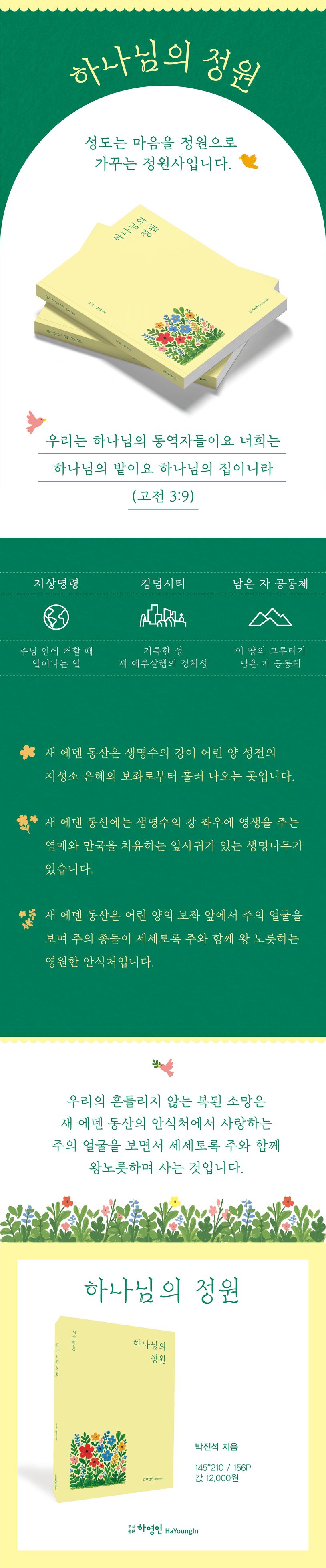 에덴동산에서 쫓겨난 인류가 예수 그리스도를 통해 새 에덴으로 돌아가는 영적 순례의 여정을 그립니다. 저자는 성도의 마음을 하나님의 텃밭이자 성전으로 경작하고 지키는 사명이 오늘날 신앙과 목회의 본질임을 강조합니다. 성도는 예수님의 마음을 닮은 좋은 마음 밭을 이루고, 복음의 생명수를 세상에 흘려보내는 축복의 통로가 되어야 합니다. 복음은 유대인을 시작으로 이방인에게까지 퍼지며, 마지막 추수의 때에는 모든 알곡이 하나님의 곳간에 모이게 될 것입니다. 성전은 이제 돌로 된 건물이 아니라, 예수 그리스도를 머릿돌로 삼은 성도들의 마음에 지어지는 거룩한 집입니다. 성도는 날마다 마음 밭을 갈고 복음의 씨를 뿌려야 함을 상기시킵니다. 책을 통해 믿는 자들이 믿음의 눈으로 주의 얼굴을 바라보며, 새 창조의 소망을 품고 경건한 삶으로 천국을 살아낼 것을 도전합니다.