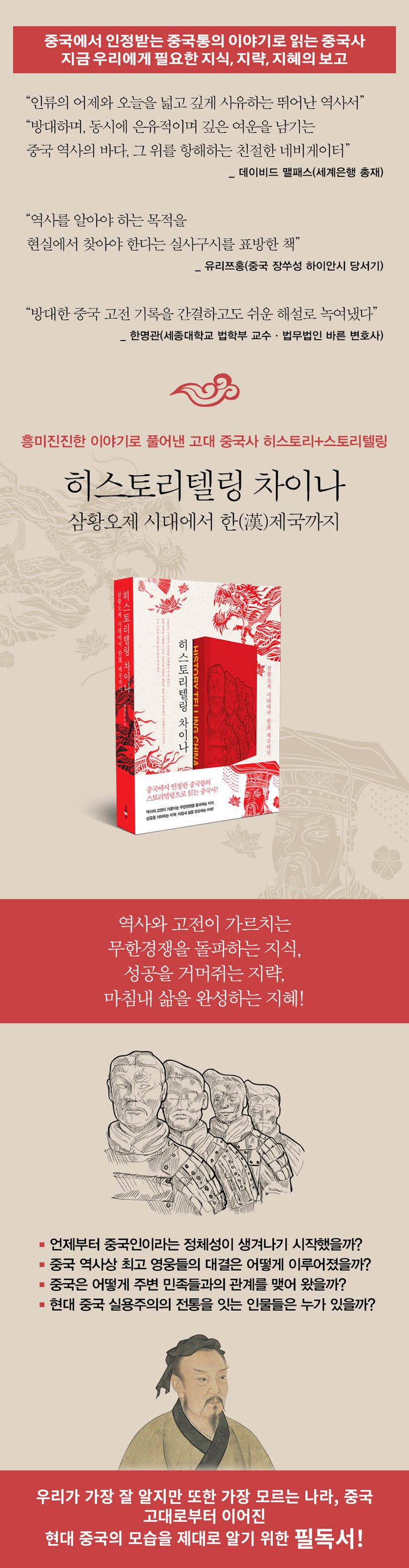 무한경쟁 시대를 살아가는 우리에게 필수적으로 요구되는 지식, 적자생존의 냉혹한 자본주의적 질서를 돌파하는 지략, 동시대를 살아가는 사람들과 더불어 삶을 완성해가는 지혜가 넘실거리는 바다가 곧 중국사라고 한다면, 이 책 『히스토리텔링 차이나』는 그 광대한 중국사의 바다에서의 항해를 돕는 친절하고도 충실한 네비게이터다. 이야기를 따라가다 보면 역사가 과거의 기록을 넘어서 오늘을 살아가는 우리에게 절대적으로 필요한 지식, 지략, 지혜를 가르치고 있음을 깨닫게 될 것이다.
