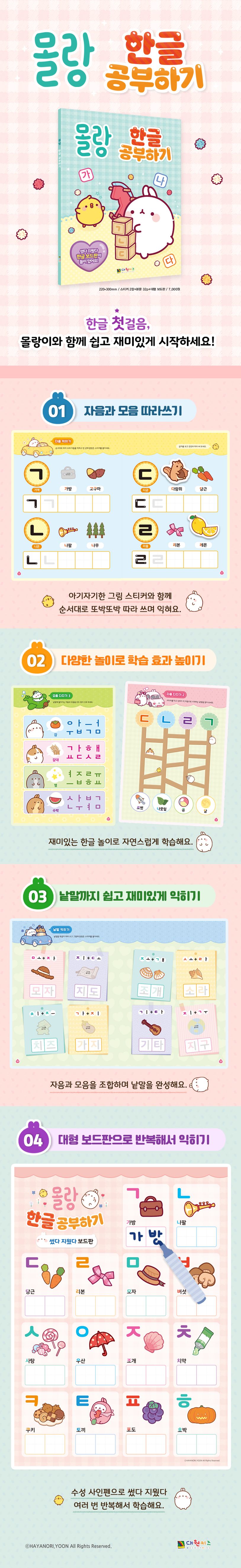 귀여운 몰랑이와 함께하면 한글 공부가 더 재미있어져요. 아기자기한 그림들과 스티커 활동, 다양한 게임을 통해 더 재미있게 한글을 익혀 보세요. 글자를 따라 쓰고 자음과 모음을 조합해 낱말을 만들며 학습할 수 있어요. 특별 부록 썼다 지웠다 대형 보드판에 여러 번 복습하며 더욱 완벽하게 학습해 보세요.