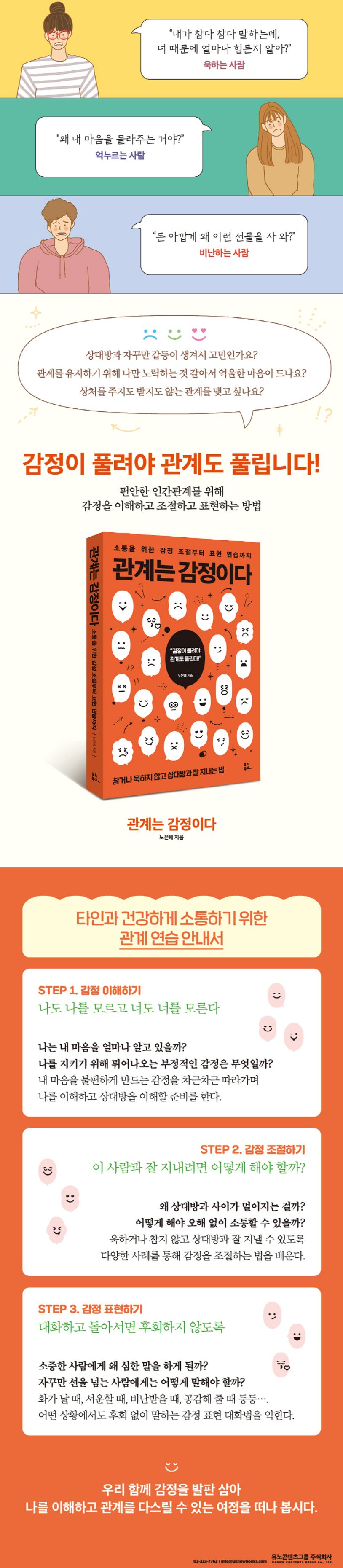 1장에서는 내 마음을 불편하게 만드는 감정이 무엇인지 찾고 그 감정의 출처를 차근차근 따라가며 나를 이해하는 시간을 갖는다. 2장에서는 상대방과 오해 없이 소통하는 법, 부정적 감정을 긍정적 감정으로 바꾸는 법 등 주변 사람과 잘 지내기 위한 감정 조절의 기술을 안내한다. 3장에서는 상처를 주지도 받지도 않고 후회 없이 대화하는 방법을 다양한 예시를 들어 소개한다.