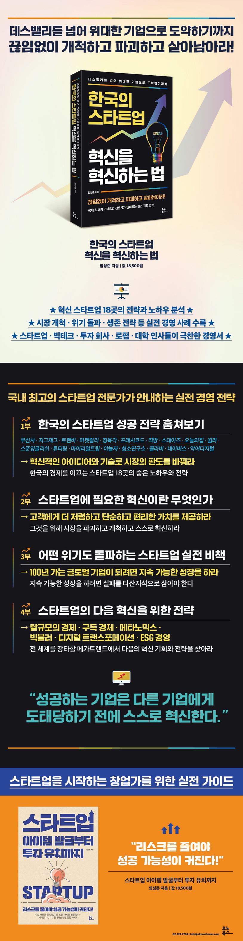 스타트업의 여정을 시작한 사람들의 교과서가 된 ‘실전 창업 가이드’ 《스타트업 아이템 발굴부터 투자 유치까지》의 저자 임성준은 이 유일한 경영 전략을 속속들이 안내한다. 1부에서는 패션테크, 푸드테크, 프롭테크, 에듀테크, 트래블테크, O2O, 인공 지능, 모빌리티 분야에서 혁신에 혁신을 거듭하며 경제 시장의 판도를 뒤집은 한국의 스타트업 18곳의 내공을 엿보았다. 이를 통해 성공 가도를 달리는 기업들이 찾은 고객의 페인 포인트와 그 점을 해결하며 시장을 개척한 방법을 알 수 있을 것이다. 2부에서는 스타트업이 성공을 거듭하려면 필요한 혁신이란 무엇인지 안내하고, 3부에서는 스타트업이 사업 다각화와 확장을 할 때는 물론 경쟁, 시행착오, 시스템 개선을 할 때 맞닥뜨리는 위기들을 대비할 수 있도록 비책을 준비했다. 마지막 4부에서 세계적인 메가트랜드 속에서 스타트업이 다음 혁신을 준비할 수 있도록 전략들을 제시했다.