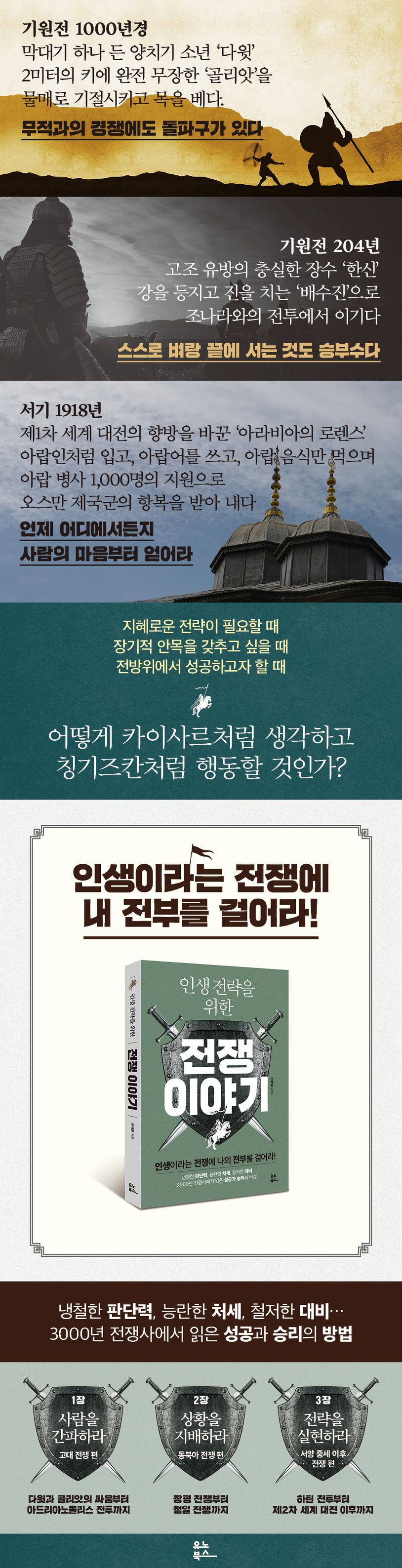 우리네 인생도 마찬가지다. 강해 보이는 상대와의 경쟁에서도 돌파구가 있고, 절체절명의 위기를 절호의 기회로 바꿀 수도 있다. 상대방의 심리를 파악하고 압도하면서 상황을 주도하고 지혜롭게 이길 수 있다. 인간의 역사 그 자체인 전쟁에는 지금 필요한 인생의 병법들이 가득하다. 알렉산드로스, 한니발, 카이사르 등 압도적인 승리를 거둔 사람들에게서는 용감한 모습, 솔선수범하는 태도, 전략 전술 수행 능력, 위기에 버티는 기술을 배울 수 있다. 성급하게 전쟁을 일으켜 죽음을 자초한 크라수스, 합당하지 않은 명령에 복종한 카디건 경 등 패배한 장수에게서는 자신을 돌아보고 내일을 준비할 수 있는 자세를 배울 수 있다.