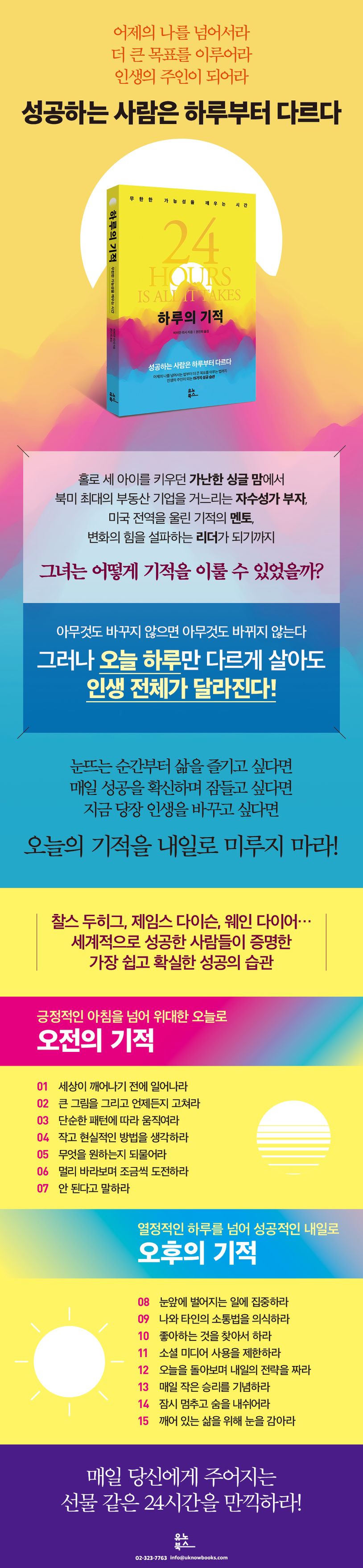 지금부터 과장과 거짓을 쏙 빼고 가장 쉽고 확실한 성공 방법에 대해 말하겠다. 삶을 바꾸는 기적은 단 하루 만에 이루어진다! 아무것도 하지 않으면 아무것도 바뀌지 않는다. 그러나 오늘 단 하루만 열정적으로 살아도 인생 전체가 달라진다. 토니 로빈스, 찰스 두히그, 제임스 다이슨처럼 세계적으로 성공한 사람들은 이 사실을 누구보다 잘 알고 있다. 이들처럼 자신에게 주어진 하루하루를 무한한 가능성이 깨어나는 시간으로 만들기 위한 성공 습관 15가지를 안내한다.