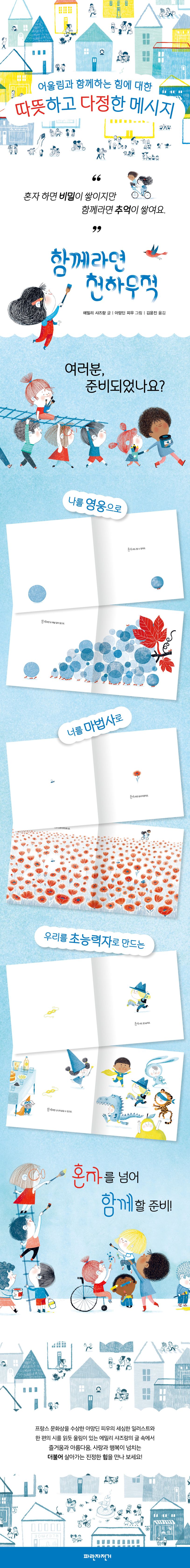 《함께라면 천하무적》은 더불어 살아가는 사회에서 지속 가능한 공동체를 만들어 가기 위해 우리가 꼭 알아야 하는 “함께함”의 가치와 소중함을 전하는 그림책입니다. 아무도 모르게 비밀을 쌓기보다는 시간을 함께 보내며 추억을 쌓을 수 있고, 내 이익을 앞세워 따져 보기보다는 어울려 나누는 기쁨을 만끽할 수 있고, 풍요롭지만 쓸쓸하고 외롭기보다는 함께 나누며 마음속 온기를 채워 나갈 수 있고, 혼자 해내야만 하는 부담감보다는 함께이기에 무한한 가능성을 경험하게 되는 것이 바로 “함께하는 힘”입니다. 서로를 이해하고 공감하고 협력하고 나눔으로써 얻는 기쁨과 행복, 다름과 지식을 공유함으로써 얻는 경험과 배움의 힘이 얼마나 큰지 알아 가는 뜻깊은 시간이 될 것입니다.