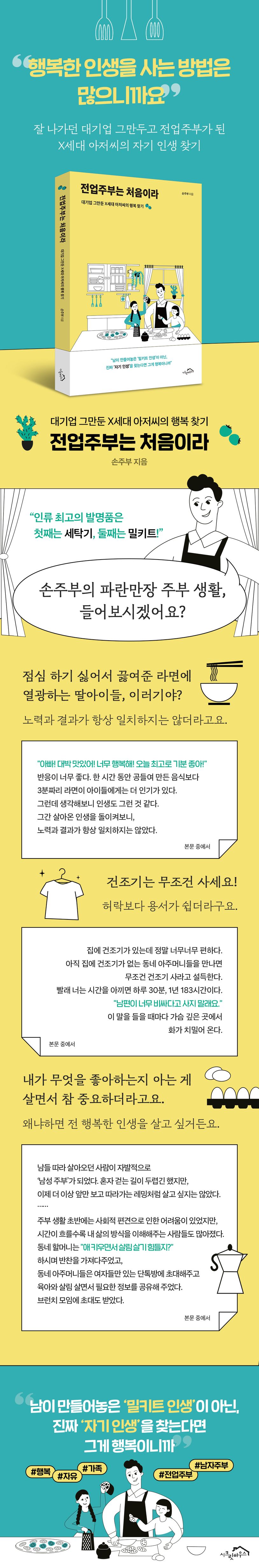 책 《전업주부는 처음이라》는 잘 나가던 40대 직장인(X세대 아저씨)이 안정적인 대기업을 그만두고 전업주부의 삶을 살기로 결심한 이후 일어나는 일상의 변화를 통해 행복을 찾아가는 이야기다. 초보 전업주부로서 겪는 살림 사는 이야기와 요리와 빨래, 청소에 이르기까지 한층 프로가 되어가는 모습, 그리고 몰랐던, 아니 잊었던 가족의 모습을 발견하면서 일상을 촘촘한 행복으로 채워가는 모습이 가득하다.