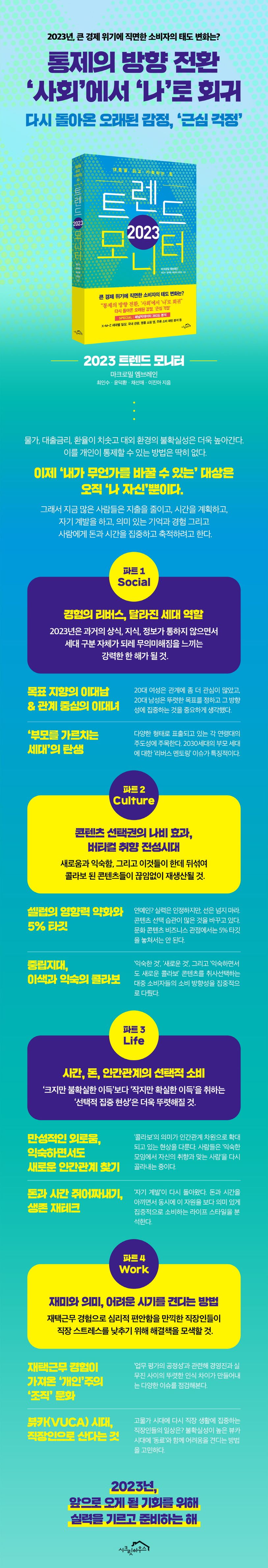 큰 경제적 위기를 경험한 ‘내재적 기억’은 사람들로 하여금 보수적으로 움직이게 하고, 단 한 번의 실패 경험이 없는 ‘성공적 우월감’은 불황을 투자의 기회로 여기게끔 만들 수 있다. 이런 관점에서 보면, 미래는 ‘객관적 통계 수치’가 아니라, ‘다수의 대중’이 어떤 방향의 태도를 취하는가에 달려 있을 것이다. 이런 차원에서 저자들은 《2023 트렌드 모니터》에 현재를 사는 ‘대중의 생각과 태도’를 담았다.