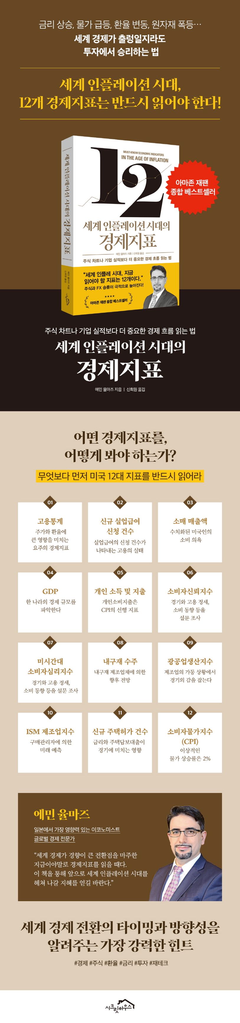 책 《세계 인플레이션 시대의 경제지표》는 일본에서 가장 영향력 있는 이코노미스트 에민 율마즈가 투자자와 경제를 배워나가는 독자들을 위해 경제지표를 읽는 법, 활용하는 법을 설명한 책이다. 인플레이션 시대에서 어떤 경제지표를, 어떻게 봐야 하는지 조언한다. 투자자나 금융기관이 참고하는 핵심 경제지표, 지표를 읽을 때 도움 되는 경기복합지수, 경기를 읽는 단서가 되는 기업 등을 이 한 권에 모두 담았다.