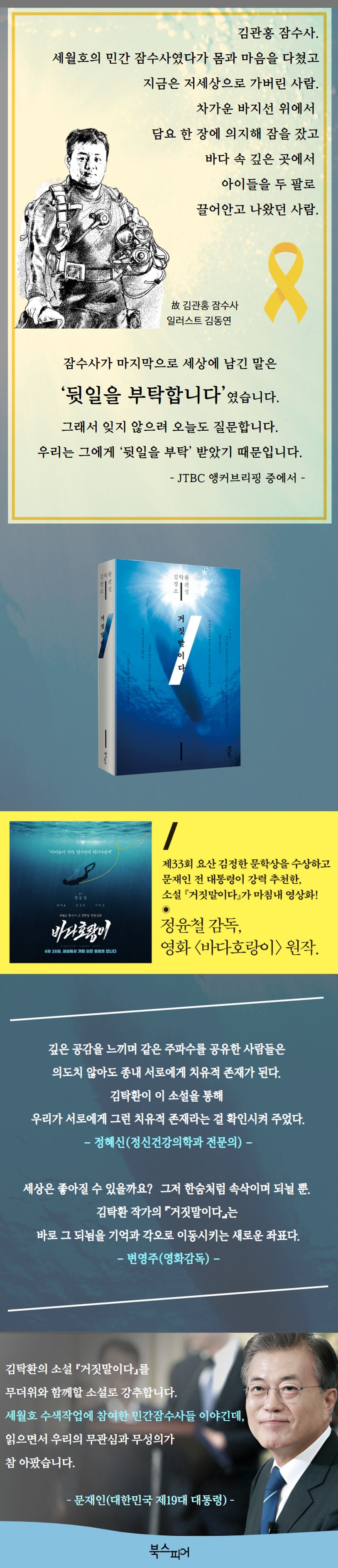 알 수 없는 이유로 거대 여객선이 침몰한 맹골수도에서 시계 제로의 심해로 내려가야만 했던 잠수사들의 목소리를 르포르타주 형식으로 풀어가는 소설 『거짓말이다』는