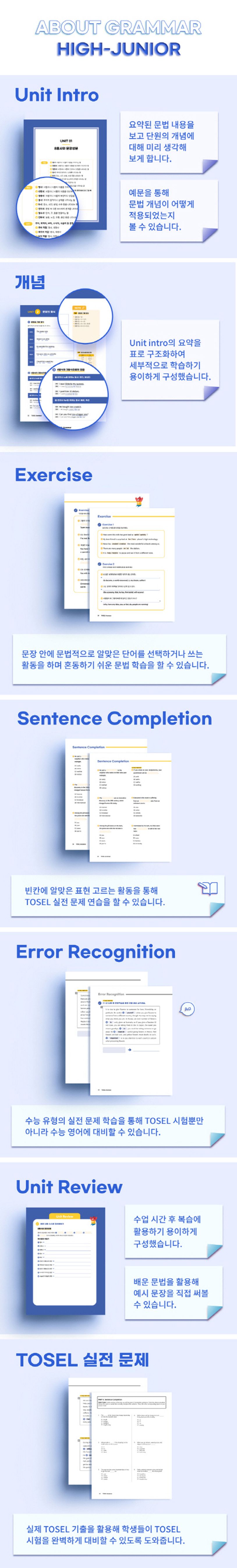 초등 교과과정 연계 문법 학습 및 세분화된 레벨링과 TOSEL 시험을 기준으로 빈출 지표를 활용한 문법 선정을 통해 TOSEL의 Grammar Series는 레벨에 맞게 단계적으로 문법을 학습할 수 있습니다.