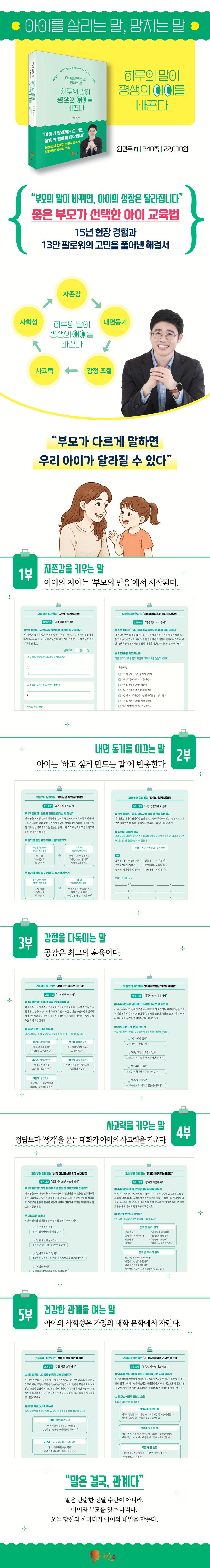 이 책은 15년간 수천 명 이상의 부모와 아이를 상담해 온 아동 발달 언어 치료 전문가 원민우 교수가 전하는 “부모 언어 습관 코칭북”입니다. 저자는 오랜 임상 경험과 실제 부모 교육 사례를 바탕으로 아이를 움직이게 하고, 스스로 성장하도록 돕는 말의 기술을 체계적이고 실천할 수 있는 방식으로 정리하였습니다.
