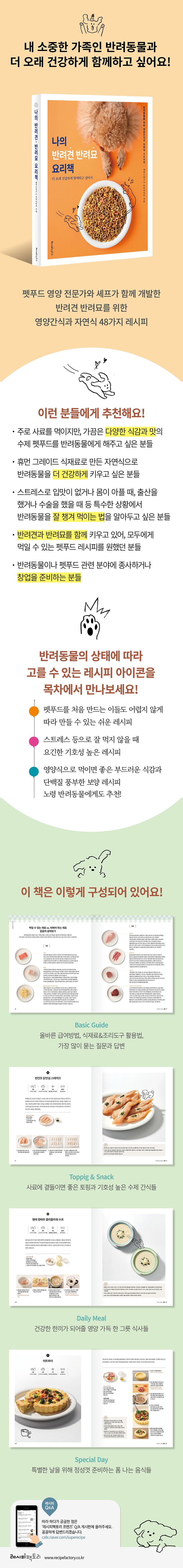 이 책은 이렇게 내 소중한 가족, 반려동물의 식생활, 건강, 행복, 무병장수 등을 고민하는 반려인들을 위해 만든 것입니다. 저자는 오랜 반려인이자 자타 공인 미식가 커플로, 한 분은 펫푸드 영양학 전문가(김초롱)이고 다른 한 분은 미슐렝 레스토랑 출신 셰프(박규원)입니다.