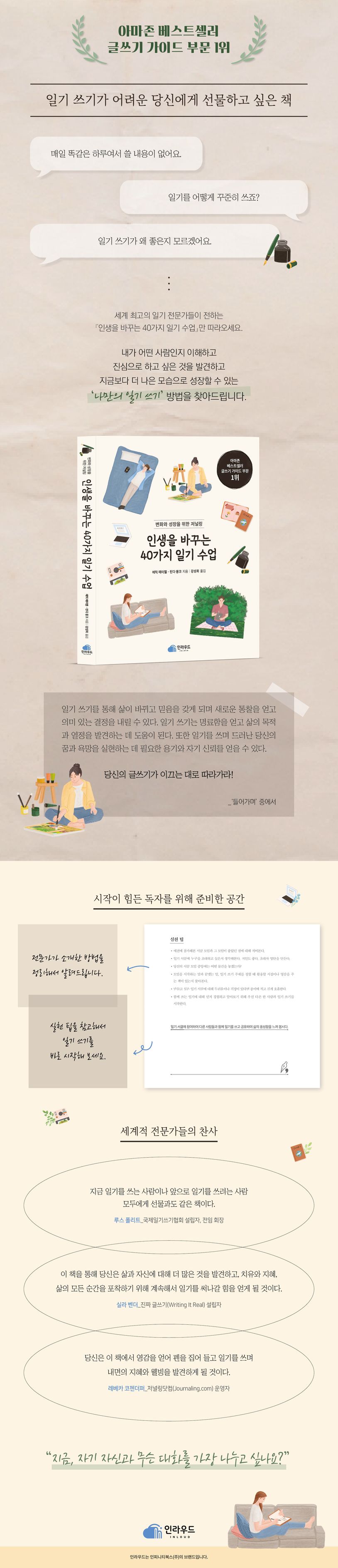 그 해답은 이 책을 읽으며 스스로 발견해나갈 수 있다. 〈인생을 바꾸는 40가지 일기 수업〉은 일기 쓰기를 통해 인생을 바꿀 수 있는 기회를 제공한다. 그저 글자를 적는 것이 아닌, 인생의 기록을 남겨 변화의 토대를 쌓아 올리는 것이다.