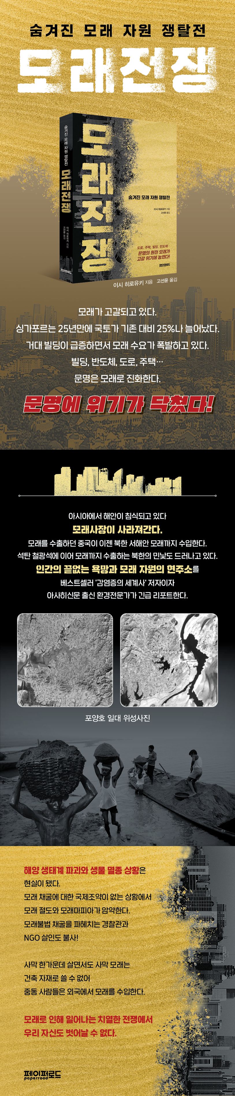 세계의 모래가 고갈되고 있다. 거대화되어 가는 도시가 탐욕스럽게 모래를 빨아들이고, 인류가 지구 생태용량을 초과할 정도로 골재, 실리콘칩, 유리, 인터넷 광케이블 등을 무분별하게 소비하면서 현대 문명의 원천인 모래가 사라져 가고 있다.