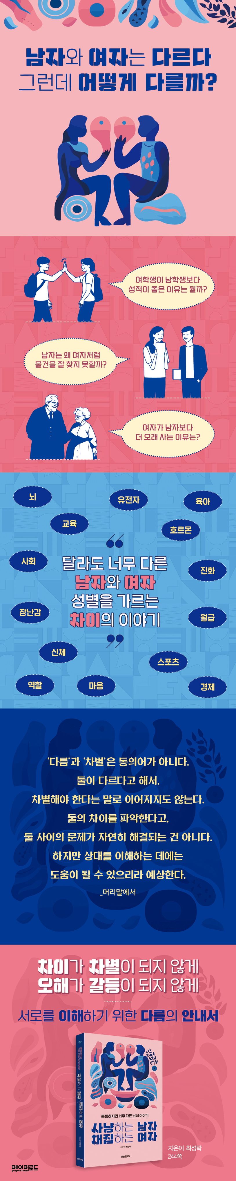 남자와 여자는 다르다. 일상에서 발견하는 사소한 모습에서부터 학술적으로 검토된 수많은 연구에 이르기까지, 우리는 두 성별이 다르다는 사실을 매일같이 확인한다. 그러나 누군가는 이에 불안 내지는 불만을 느낀다. 학문의 이름으로 차별을 정당화한 역사적 경험 때문에, 성차를 인정하면 결국 성차별로 이어지지 않을까 우려한다. 어느 순간부터 남녀의 차이를 외면하고 언급하지 않는다. 아무런 근거 없이 “남자와 여자는 원래 똑같다.”라고 생각한다.