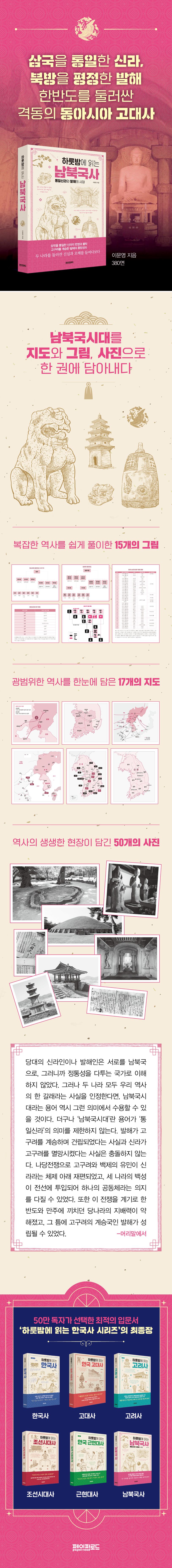전작 《하룻밤에 읽는 한국 고대사》, 《하룻밤에 읽는 조선시대사》에서 역사 속 흥미진진한 이야기를 친절하게 풀이한 이문영 작가는 신간에서도 다양한 이야기를 수록해 독자의 흥미를 끈다. 수많은 사료를 검토해 역사를 합리적으로 설명하면서도 이따금 당대 문화를 이해하는 데에 필요한 설화, 향가, 한시, 그림, 유물을 소개한다. 또한 독자의 이해를 돕고자 그림 15개, 지도 17개, 사진 50개를 삽입하고 하단에 보충 설명을 달았다. 한국 고대사를 둘러싼 거짓과 오해를 반박하기 위해 학계의 최신 성과까지 섬세하게 해설한다. 이 책을 읽는 독자들이 한국 고대사 최후의 하이라이트인 남북국시대를 즐겁게 배울 수 있기를 기대한다.
