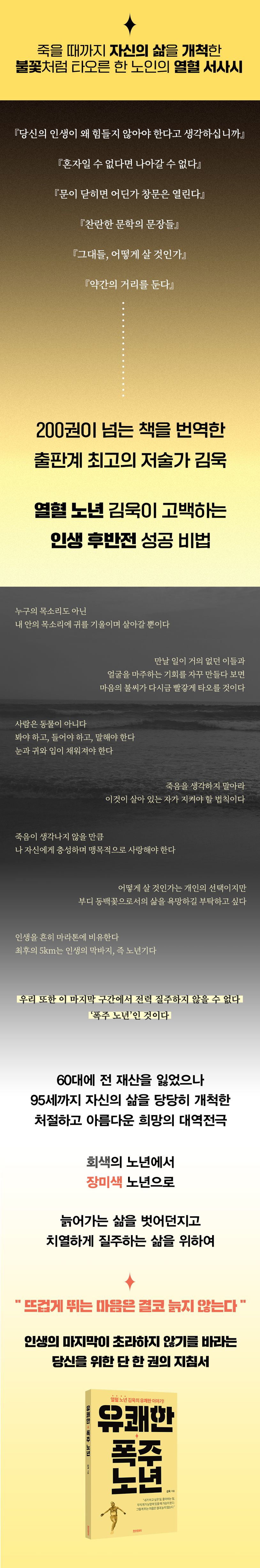 김욱 작가는 사실 번역 의뢰 때문에 만났다. 몇 권의 일서를 기획해 김욱 작가에게 메일을 보냈다. 출판사 대표는 50대 번역자로 지레짐작하여 출판사로 오라고 했다. 그런데 웬걸, 직접 만나서 뵌 작가는 당시 백발이 성성한 80대의 점잖은 노인이었다. 예상 밖의 노인을 뵌 필자는 일식집으로 모셔 정식과 함께 소주를 대접했다. 노인분께 “나이가 들면 아무래도 배우자에게는 약해지시고 부드러워지지 않냐?”라고 통상의 질문을 했다. 그런데 이 노인 작가는 당시에도 화가 나면 아내에게 “이 이상 화나게 하면 해운대에 휘몰아치는 집채만큼 큰 파도에 들어갈 것”이라 말하며 고집을 꺾지 않는다고 하였다. 완전히 폭주 노년이었다. 편집자는 그 자리에서 ‘폭주 노년’을 주제로 에세이를 쓰자고 했고, 김욱 작가는 그 자리에서 흔쾌히 수락했다. 100일 만에 나온 원고는 정말로 재미있고, 의미가 있었다. 60대 중반에 보증을 잘못 서 쫄딱 망한 뒤 번역을 무기로 재기한 이야기도, 노인의 패기 있는 삶의 태도를 설파하는 내용도 점차 노화되는 사회에 의미를 던지는 것 같았다.