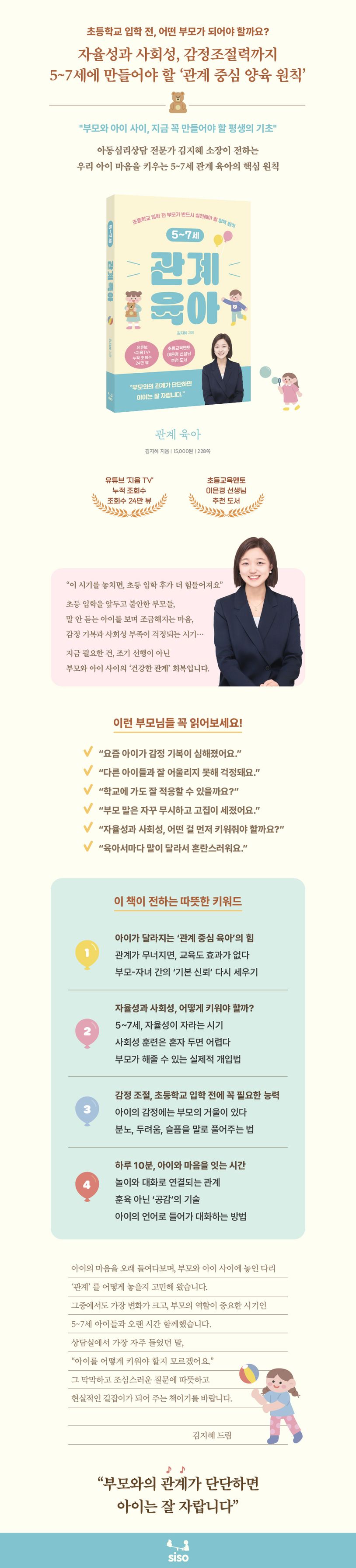 5~7세는 아이의 자율성과 사회성이 폭발적으로 성장하는 시기이다. 이제 막 유아기를 지나 초등 입학을 앞둔 이 시기에 아이는 독립심을 키우고, 부모와의 관계 속에서 자신감을 쌓으며 세상과 본격적인 첫걸음을 내딛는다. 하지만 이 시기의 부모는 넘쳐나는 육아 정보 속에서 ‘무엇이 맞는지, 어떻게 해야 내 아이에게 가장 좋은지’를 고민하면서 더 큰 혼란과 불안을 겪기도 한다.