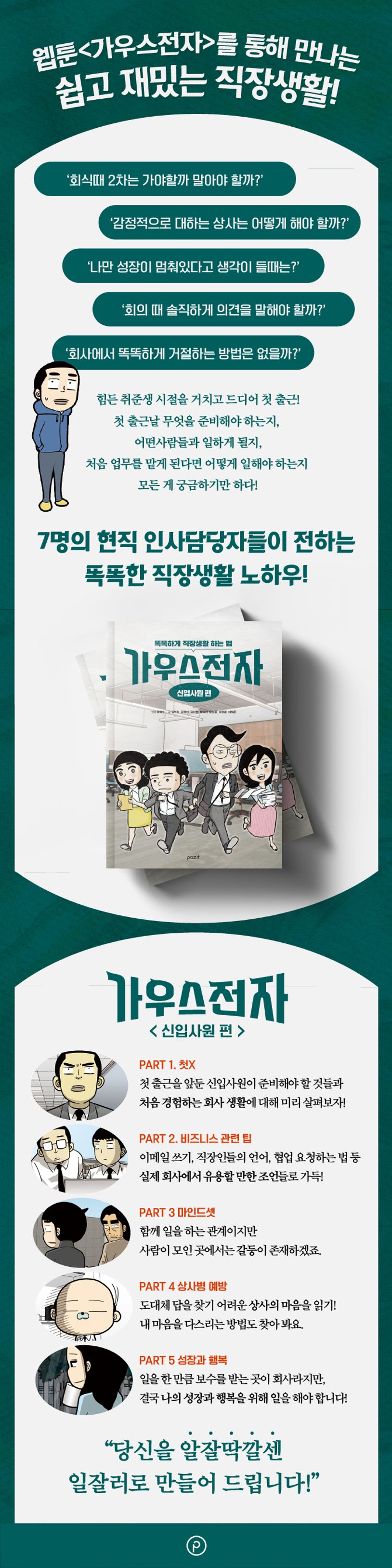 힘든 취준생 시절을 거치고 드디어 첫 출근을 하게 되었다. 회사 생활은 처음이라 앞으로 어떤 일이 펼쳐질지 두근대는 마음이다. 첫 출근날 무엇부터 준비해야 하는지, 어떤 사람들과 일하게 될지, 처음 업무를 맡게 된다면 어떻게 일해야 하는지 모든 게 궁금하기만 하다. 이때 하나하나 알려주는 좋은 선배가 있다면 얼마나 좋을까? 《가우스전자: 신입사원 편》은 현직 인사담당자 7명이 알려주는 첫 출근을 앞둔 신입사원을 위해 똑똑하게 회사 생활을 할 수 있는 꿀팁으로 가득하다. 지금 첫 출근을 앞둔 신입사원은 물론, 아직도 회사 생활이 어려운 직장인들이라면 옆에 두고 항상 참고할 수 있다. 〈가우스전자〉 웹툰의 공감백배 댓글로 어려움을 함께 나누고, 실제적인 조언들이 현명한 직장인, 일잘러의 길로 안내해줄 것이다.