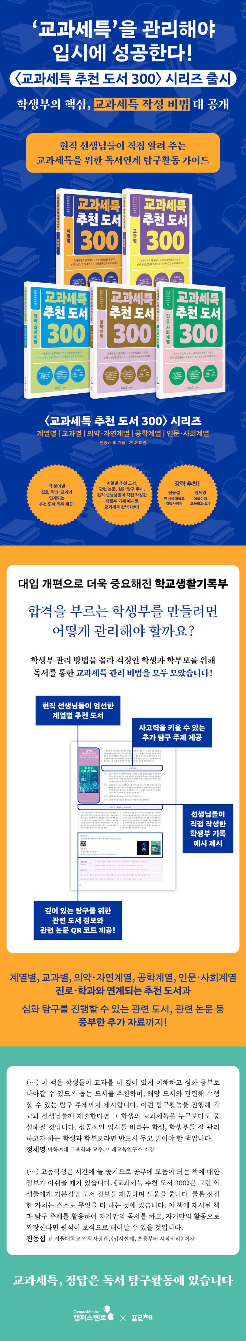 수능과 내신의 변별력이 떨어진 대입 개편안으로 인해 대입에서 학교생활기록부가 매우 중요해졌다. 특히 강조되는 것은 각 교과 선생님들이 직접 작성해 주는 ‘교과 세부능력 및 특기사항(이하 ‘교과세특’)’이다. 학생부 교과세특을 잘 관리하는 비법은 무엇일까? 정답은 ‘독서’에 있다. 《교과세특 추천 도서 300》 시리즈는 현장에서 치열하게 진학 전략을 분석하고 고민하는 선생님들이 학생부 교과세특이 중요하다는 건 알지만 관리할 방법을 모르는 학생과 학부모, 입시를 대비하는 학생들에게 어떤 자료를 주어야 할지 고민하는 교사들을 위해 힘을 합쳐 집필한 독서연계 교과세특 탐구 가이드북이다. 각 분류별로 꼼꼼하게 선정한 추천 도서와 도서별로 제공되는 탐구 가이드를 활용한다면 독서에 흥미를 갖지 못하던 학생조차도 관심 분야에 맞는 도서를 읽으며 관련 지식을 쌓고, 동시에 대입도 성공할 수 있을 것이다. 희망 진로·학과에 관련된 지식을 더 쌓고 싶은 학생, 희망 학과에 맞는 학생부·나만의 개성을 살린 학생부를 만들고 싶은 학생, 더불어 다양한 책을 통해 진로를 탐색하고 싶은 학생들까지 모두에게 유용해 꼭 한 권씩 두고 참고하면 좋은 책이다.