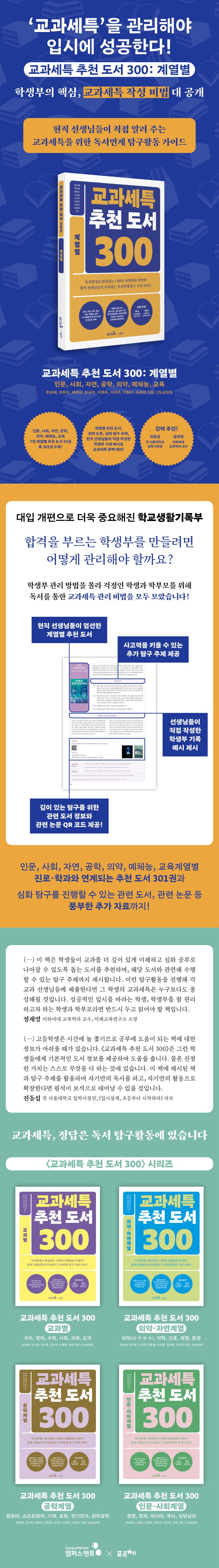 수능과 내신의 변별력이 떨어진 대입 개편안으로 인해 대입에서 학교생활기록부가 매우 중요해졌다. 특히 강조되는 것은 각 교과 선생님들이 직접 작성해 주는 ‘교과 세부능력 및 특기사항(이하 ‘교과세특’)’이다. 학생부 교과세특을 잘 관리하는 비법은 무엇일까? 정답은 ‘독서’에 있다. 《교과세특 추천 도서 300: 계열별》은 현장에서 치열하게 진학 전략을 분석하고 고민하는 선생님들이 학생부 교과세특이 중요하다는 건 알지만 관리할 방법을 모르는 학생과 학부모, 입시를 대비하는 학생들에게 어떤 자료를 주어야 할지 고민하는 교사들을 위해 힘을 합쳐 집필한 독서연계 교과세특 탐구 가이드북이다. 인문, 사회, 자연, 공학, 의약, 예체능, 교육 7개 계열별로 꼼꼼하게 분류한 추천 도서와 도서별로 제공되는 탐구 가이드를 활용한다면 독서에 흥미를 갖지 못하던 학생조차도 관심 분야에 맞는 도서를 읽으며 관련 지식을 쌓고, 동시에 대입도 성공할 수 있을 것이다.