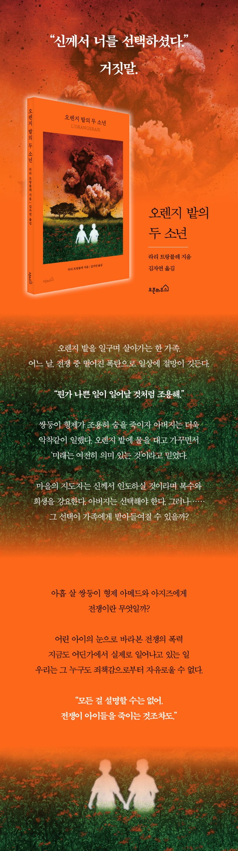 아홉 살 쌍둥이 형제 아메드와 아지즈의 눈으로 바라본 전쟁의 폭력. 독자는 부모가 되어, 쌍둥이 형제가 되어 고통에 동참한다. 그리고 묻게 된다. 아이의 죽음을 어떻게 복수라는 이름으로 정당화할 수 있는 걸까. 아이에게 “신이 널 선택했다”고 말할 수 있는 근거는 무엇일까. 우리가 믿고 있는 사실이 과연 진실일까? 지금도 지구 어딘가에서 실제로 일어나고 있는 일. 『오렌지 밭의 두 소년』은 소리 없이 울부짖는다. 우리 중 누구도 죄책감으로부터 자유로울 수 없다고, 전쟁이 우리에게 남기는 것은 무엇인가, 라고.