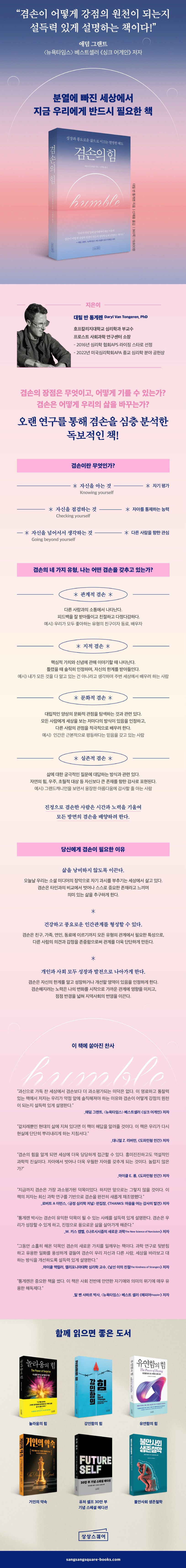 오늘날 우리는 자기 과시 풍조가 만연한 세상에서 살고 있다. 많은 사람이 성공하려면 자신을 높여야 한다고 생각한다. 반면 겸손을 야망이 부족하거나 평범한 수준에 안주하려는 태도와 동일시하며 비판한다. 하지만 연구 결과는 다르다. 겸손이야말로 육체적/정신적 건강, 인간관계, 업무 능력, 리더십을 개선하는 데 도움을 주며, 나와 우리를 성장과 성공으로 이끄는 핵심 태도이자 가치라는 것이 밝혀졌다. 나아가 이 시대에 만연한 분열과 비교의 함정에서 벗어나는 방법 또한 겸손이라고 이 책은 말하고 있다.