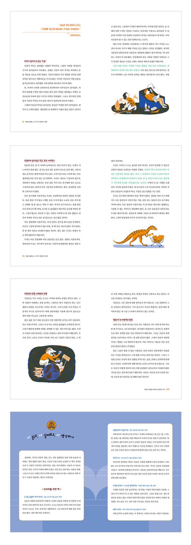 우리는어느새‘인류’,‘지구’,‘21세기’,그리고‘커다란책임’등거창한단어들과마주하고있다.지금‘나’부터무엇을할수있을지고민해보는시간을가져보도록하자.절대로지구를,이세상을구하라는것이아니다.그냥내삶에서아주조금만태도를바꾸면되는일이다.그래야훗날에우리청소년들이꿈꾸는진짜‘신세계’를세울수있다.