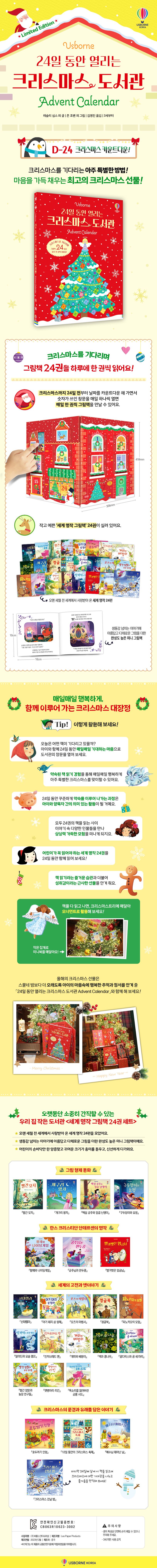「24일 동안 열리는 크리스마스 도서관 Advent Calendar」에는 작고 예쁜 ‘세계 명작 그림책’ 24권이 실려 있어요. 크리스마스 24일 전부터 크리스마스를 기다리는 마음으로, ‘크리스마스 도서관’의 스물네 개 창문을 하루에 하나씩 열어 보세요. 전 세계에서 사랑받아 온 세계 명작 그림책 24권을 만날 수 있어요. 하루에 한 권씩 그림책을 앍어 나가면, 모두 24권의 책을 읽는 사이 매일매일 행복하게 아주 특별한 크리스마스를 맞이할 수 있답니다.