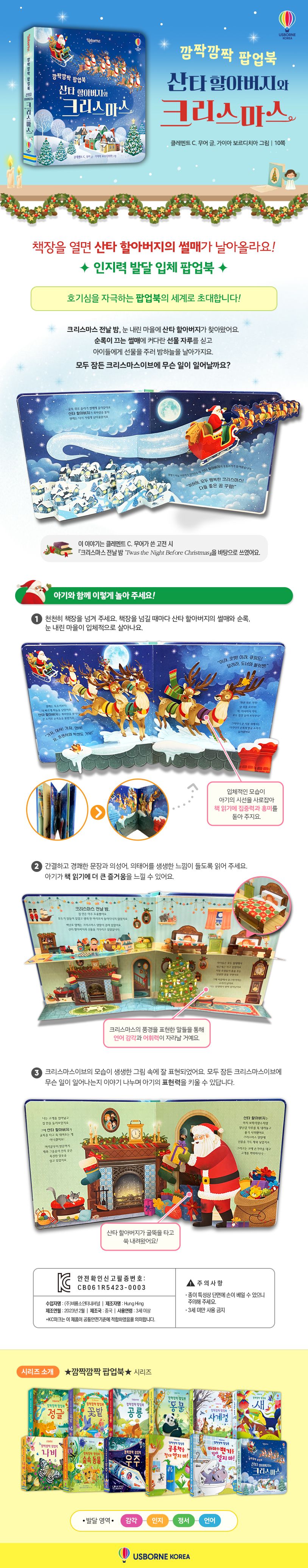 책장을 열면 크리스마스 전날 밤, 산타 할아버지를 기다리는 고요한 풍경이 펼쳐져요! 창문 밖으로 커다란 선물 자루를 실은 썰매를 타고 날아오는 산타 할아버지를 발견했어요. 지붕 위에 도착한 산타 할아버지는 굴뚝을 타고 쑥 내려와 양말 주머니에 선물을 가득 채워 넣지요. 산타 할아버지는 다시 썰매를 타고 아이들에게 선물을 주러 밤하늘을 날아가요. 이 이야기는 클레멘트 C. 무어가 쓴 고전 시 『크리스마스 전날 밤 ‘Twas the Night Before Christmas』을 바탕으로 쓰였어요. 모두 잠든 크리스마스이브에 무슨 일이 일어날까요? 상상하며 책을 펼쳐 보세요!