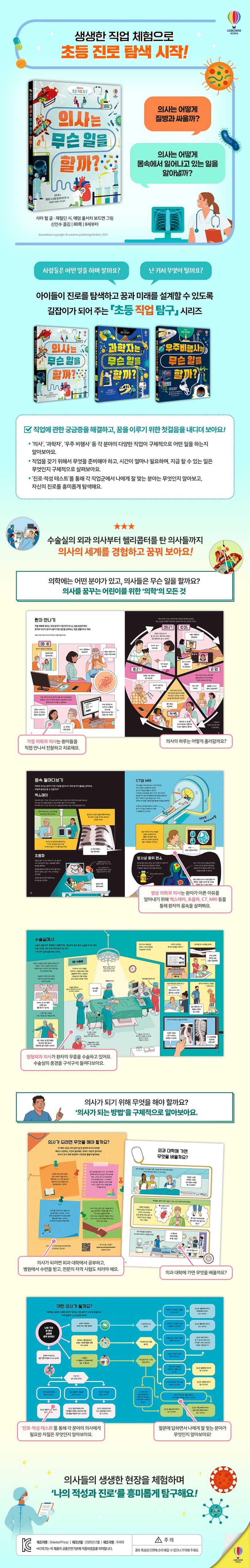 사람들은 어떤 일을 하며 살까요? 난 커서 무엇이 될까요? 어린이들이 생생한 직업 체험을 통해 진로를 탐색하고 자신의 꿈과 미래를 설계하는 데 길잡이가 되어 주는 「초등 직업 탐구」 시리즈가 출간되었다. 의사, 과학자, 우주 비행사 등 각 분야의 다양한 직업을 알아보고, 각 직업이 구체적으로 어떤 일을 하며, 어떤 장소에서 어떤 사람들과 함께 일하는지 직업에 관한 현실적인 정보를 담았다. 더불어 각 직업을 갖기 위해서는 무엇을 준비해야 하고, 시간이 얼마나 필요하며, 지금 할 수 있는 일은 무엇인지 구체적으로 살펴볼 수 있다.