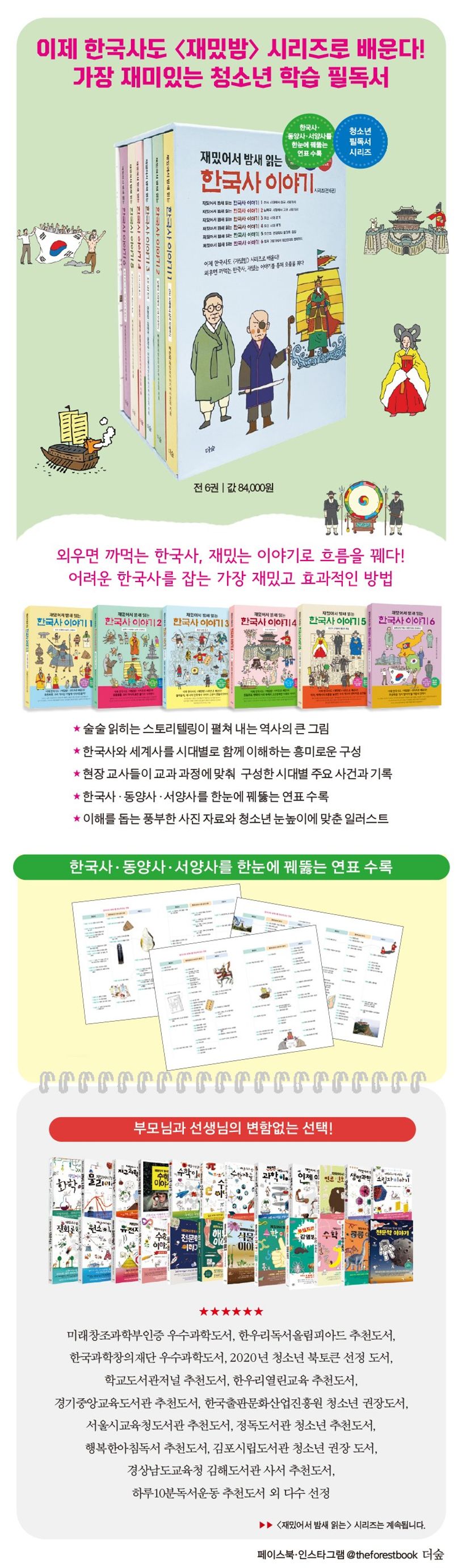청소년 필독서로 각종 추천도서와 우수과학도서로 선정되고 청소년은 물론 부모님과 선생님들의 든든한 지지 속에 꾸준히 사랑받아 온 〈재밌어서 밤새 읽는〉(이하 〈재밌밤〉) 시리즈의 ‘한국사 이야기’가 전 6권으로 완간되었다. 완간을 기념하여 특별부록인 〈한국사 · 동양사 · 서양사를 한눈에 꿰뚫는 연표 노트〉가 담긴 〈재밌밤 한국사 이야기〉 세트도 함께 선보인다.