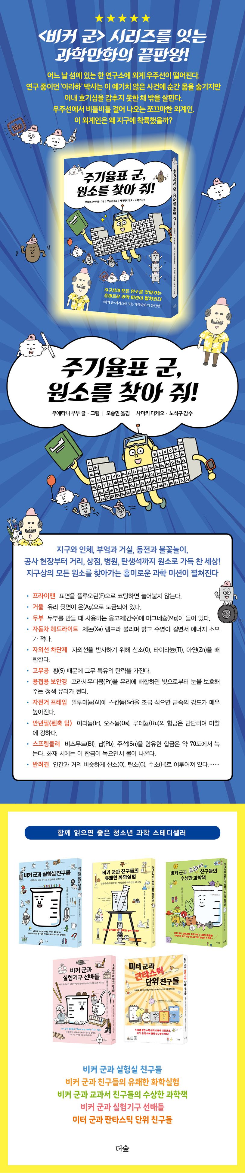 주기율표 군이 118개에 이르는 원소를 하나씩 찾아가는 과정에서 일상 속 익숙하게 보던 물건과 장소가 원소들로 가득 찬 세상이라는 것을 깨닫는다. 또한 원소와 원자의 차이, 원소명의 유래, 원소들의 독특한 성질과 용도, 주기율표의 놀라운 구성, 주기율표를 완성한 중요한 역사적 인물들에 이르기까지 학과목으로 지루하게 암기되던 원소의 모든 것은 귀여운 만화 속 캐릭터들과 신선한 스토리를 통해 살아 움직이고 자연스럽게 이해하게 된다.