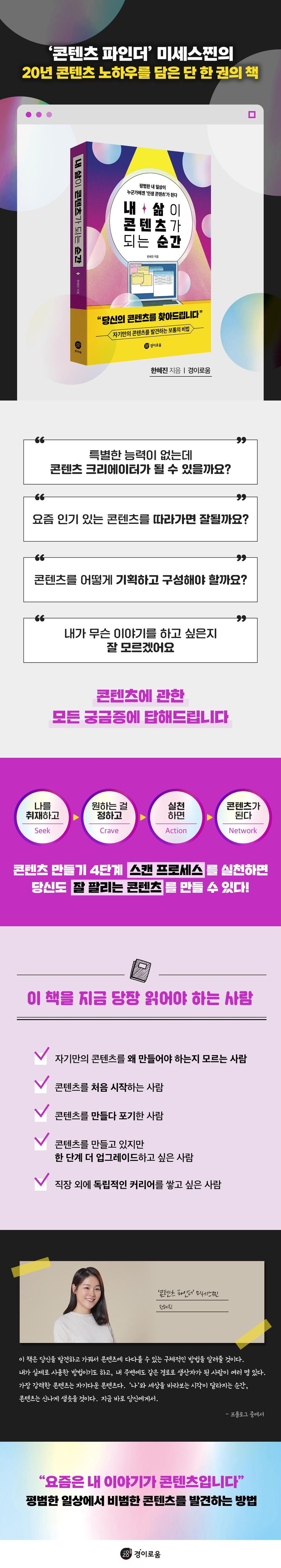 구체적으로 이 책에서는 ‘나’를 취재하기, 메시지 정하기, 시그니처 스토리 찾기 등 콘텐츠를 기획하고 구성하는 전 과정을 꼼꼼히 다루었다. 콘셉트 잡는 법, 콘텐츠 소재 찾기, 숙련 단계별 콘텐츠 작성법은 저자의 오랜 경험을 통해 다져진 비법으로, 그동안 어디서도 볼 수 없었던 내용이다. 더 나아가 콘텐츠 선배로서, 오랫동안 콘텐츠 창작자로 살아가기 위해 알아둬야 할 현실적인 조언도 빼놓지 않고 담았다.