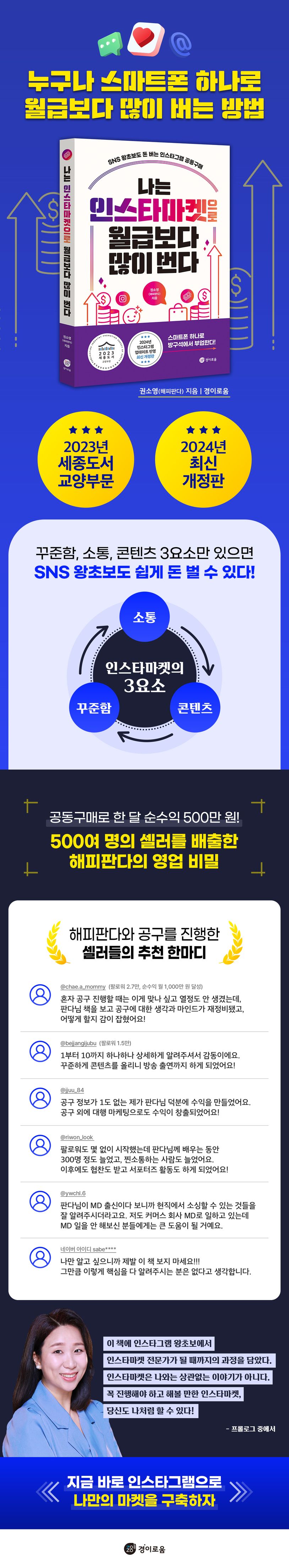 2023년 세종도서로 선정된 이 책은 인스타그램 왕초보였던 저자가 인스타마켓 전문가가 되기까지의 과정과 그동안의 노하우를 담았다. 이번 개정판에서는 릴스, 라이브 방송 등 인스타그램의 바뀐 기능과 알고리즘에 대한 내용까지 추가로 다루었다.